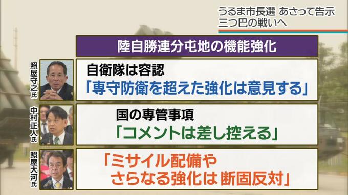 うるま市は陸上自衛隊勝連分屯地を抱えますが、自衛隊の機能強化については三者ともスタンスに違いが。