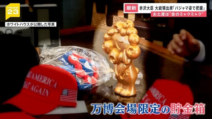 一方、赤沢大臣が持参したのは、大阪・関西万博のキャラクター「ミャクミャク」のグッズ。金色のものは貯金箱で、万博会場でしか買えない限定品です。