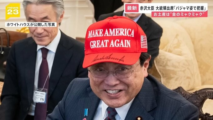 トランプ氏が赤沢大臣に渡したのは、「MAKE AMERICA GREAT AGAIN」の文字が記された帽子。ツバには、トランプ氏のサインもありました。