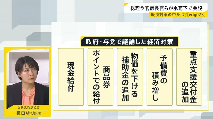 これらの案の中で、特に現金給付については、世論からの批判が強いことが見送りの大きな理由となった。「総理の10万円の商品券配布問題で、5万円配っても批判、たとえ10万円配っても不満は出てくる」と政治部記者は指摘する。