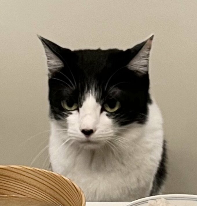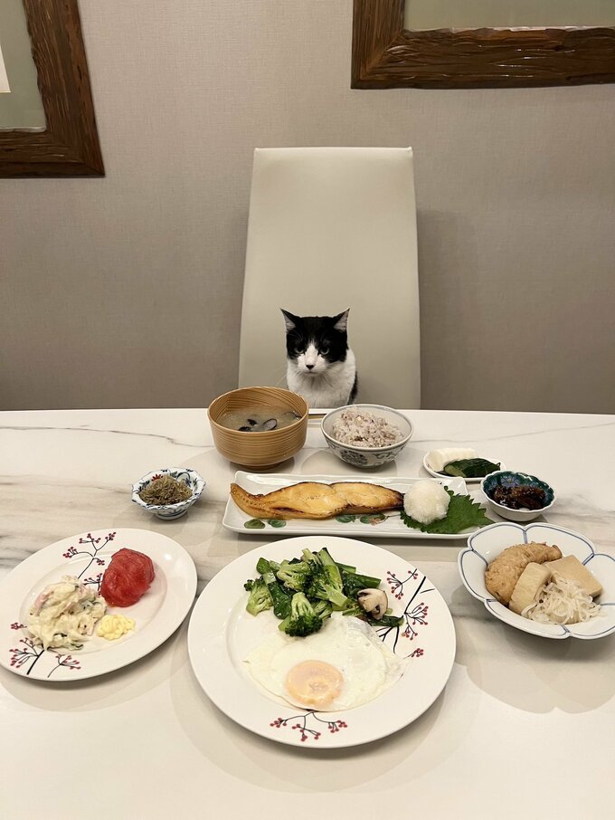 しかし、もう一方のダイニングチェアに鎮座している、藤さんの愛猫・オレオは、三白眼のまま浮かぬ顔。藤さんは「カレイを目の前にしてなんでこの顔できるの…」と呆れているようなテキストを投稿しています。