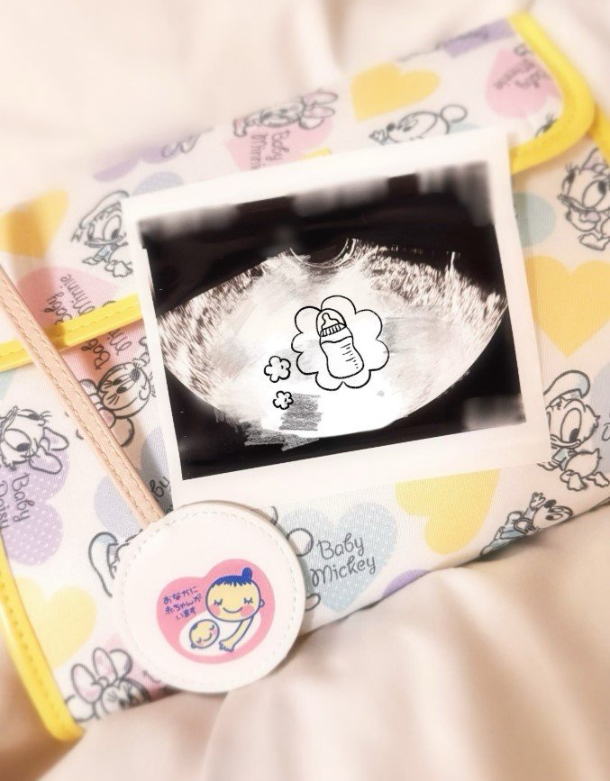 荻野さんは「新しい家族が増えます!」とテキスト。ポーチの上に胎内の赤ちゃんを写したと思われるエコー写真と、「おなかに赤ちゃんがいます」のマタニティマークを置いて撮った写真を投稿しています。