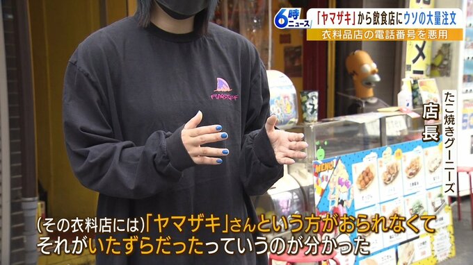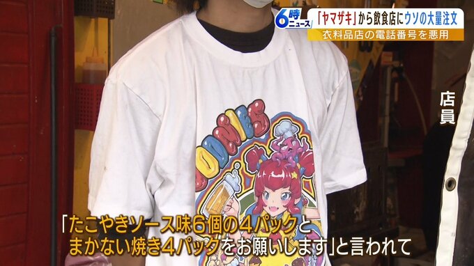 「ヤマザキ」がたこ焼きや寿司をウソ注文→電話番号は「同じ衣料品店」15件の被害...この店には『80件の出前送り付けなど被害』も 毎日放送 2022年10月24日(月) 19:29 国内 暮らし・マネー 飲食店にウソの大量注文をして、商品を受け取らず、受け取り先に「衣料品店」を指定する、といういたずら電話が大阪府内で相次いでいます。 大阪市浪速区のたこ焼き店「たこ焼きグーニーズ」。10月10日に女性の声で電話が入りました。 (店員) 「『たこやきソース味6個の4パックと、まかない焼き4パックをお願いします』と言われて」 注文はたこやきなど計8パック約2500円分。女性は「今から取りに行く」と言って電話を切ったため、店はすぐに商品を準備しました。しかし…。 (店員) 「30分ぐらいしても来なくて。ちょっとこれは1回電話かけたほうがいいなと」 注文してきたのは「ヤマザキ」と名乗る、声の感じから中年と思しき女性でしたが、伝えられた連絡先に電話すると、東大阪市の「衣料品店」に繋がったといいます。 (たこ焼きグーニーズ 店長) 「(その衣料品店には)『ヤマザキさん』という方がおられなくて、それがいたずらだったっていうのがわかったということです」