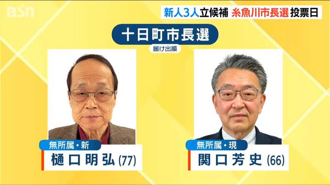 一方、十日町市では市長選が告示され、新人の樋口明弘さん(77)と現職の関口芳史さん(66)のいずれも無所属の2人が立候補を届け出ています。