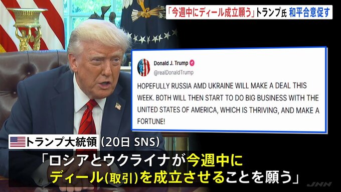 アメリカのトランプ大統領は、ロシアとウクライナが「今週中にディール=取引を成立させることを願う」などと述べ、両国にあらためて和平交渉の早期開始を促しました。トランプ大統領は20日、SNSに「ロシアとウク…