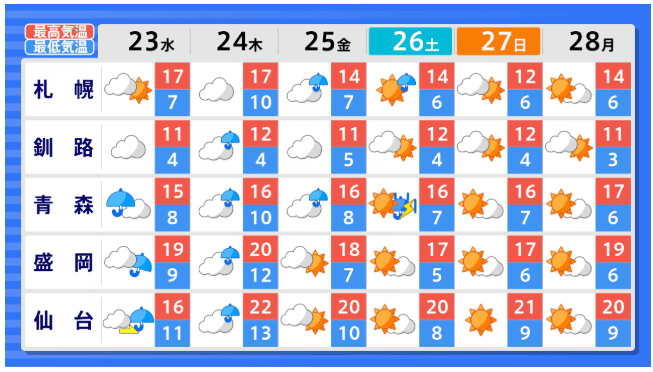 ゴールデンウィーク2025 期間前半の全国の週間天気は(4月21日配信) 北海道、東北、関東、東海、北陸、甲信、近畿、中国、四国、九州、沖縄の天気予報 テレビユー山形 2025年4月21日(月) 13:14 国内 いよいよ今週末からはじまるゴールデンウィーク。お出かけになる方は天気が気になりますよね。全国の天気を画像でわかりやすくまとめました。 ぜひ見て参考にしてください。 北海道・東北