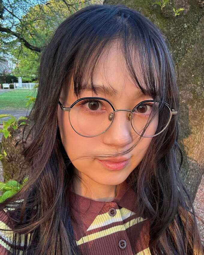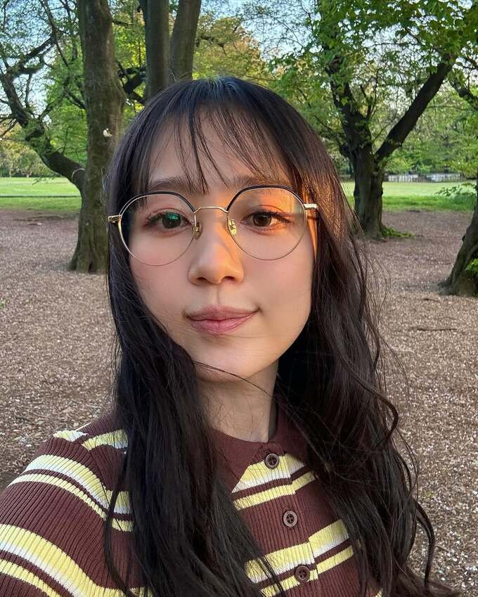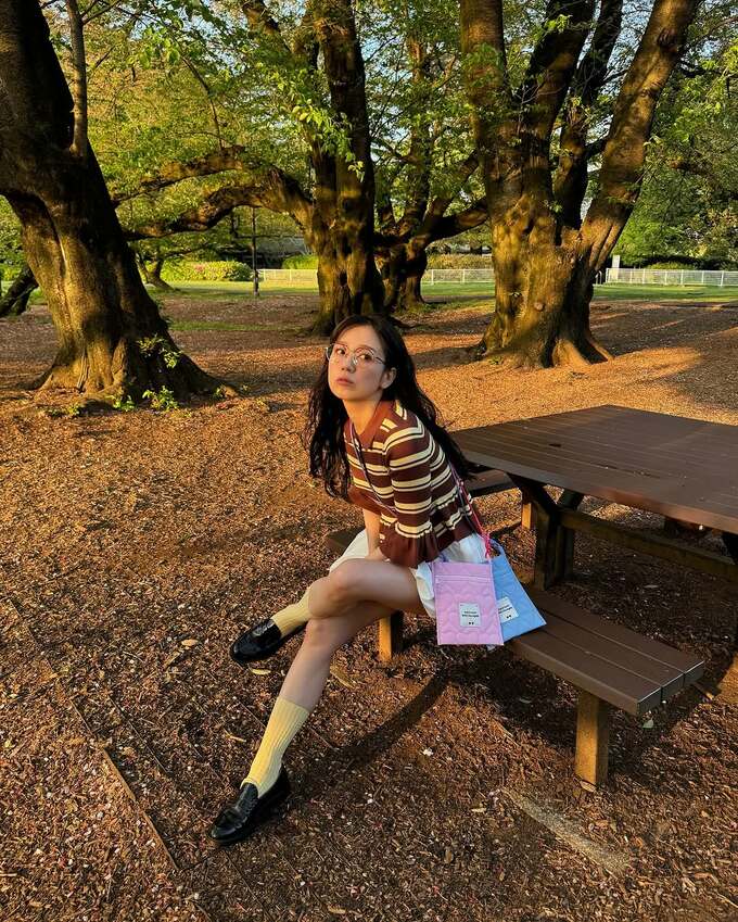 投稿された写真には、茶色と黄色、白のストライブ柄の襟付きシャツに白のプリーツが入ったバルーンスカート姿で、眼鏡をかけた西野さんが公園を散策する様子が写っています。