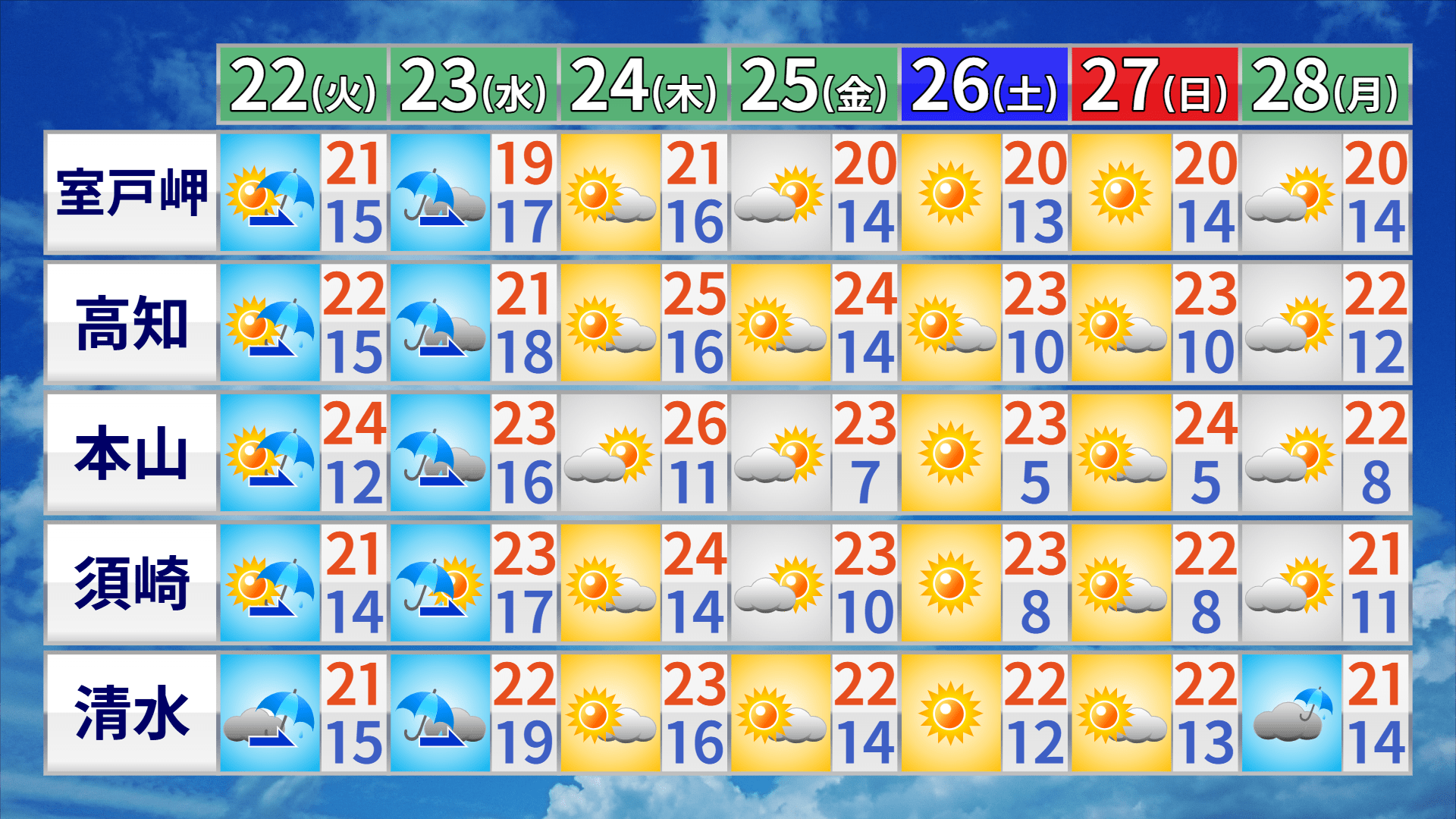 向こう1週間は晴れる日が多くなりそうです。24日までは上空の暖気の影響で高知市でも夏日が予想されています。体調の管理に注意をして下さい。
