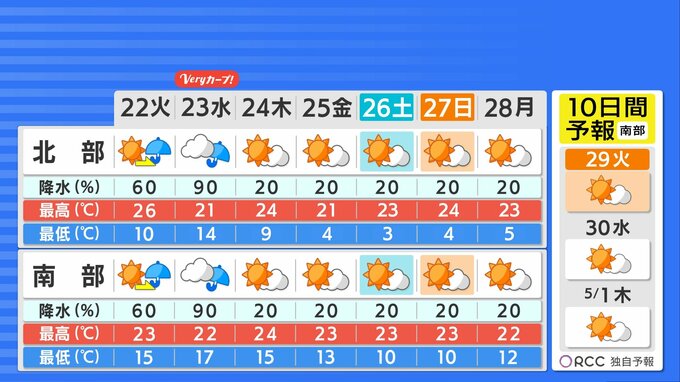 きょう21日(月)の広島県内は、日中はよく晴れて快晴の空が広がりました。最高気温は加計で27.7℃ 広島市中区で25.4℃を記録しました。日中は汗ばむ体感で、初夏の陽気となりました。そしてこの週末も気温が高くなり、特に土曜日は府中市で29.8℃ 加計で29.2℃まで上がりました。湿度が低くカラッとしていますが、まるで夏本番かのような暑さでしたね。