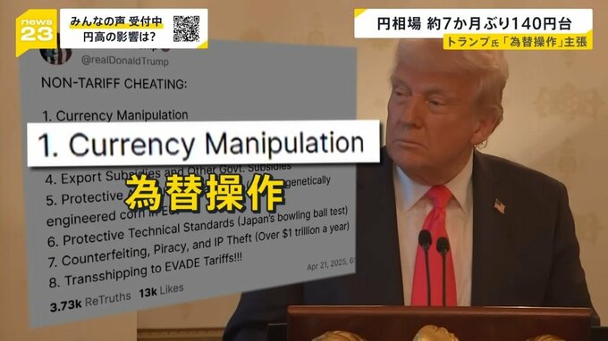 きっかけは、トランプ氏の動きです。20日、自らのSNSに、貿易の妨げになる「非関税障壁」について8つの項目を投稿。このうちの1つに挙げたのが「為替操作」でした。