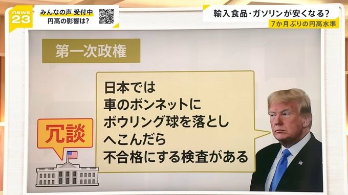 関税についても相変わらず、トランプ大統領は「ボウリング球によるテストがあるからアメリカ車が日本で売れないんだ」と主張しています。