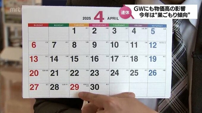 多い人では最大11連休となるゴールデンウィークが今週末から始まります。民間の調査会社によりますと、今年は物価高の影響で巣ごもりの傾向があるようです。(三浦功将記者)「今年のゴールデンウィーク。カレンダ…