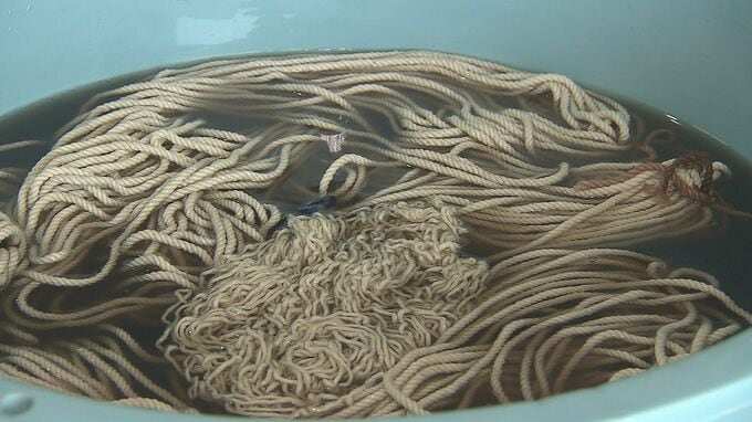 糸を煮汁と染料を染み込ませる液に、交互に漬け込みます。白色の糸がターム色に染まりました。