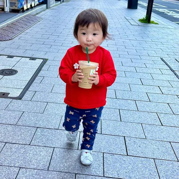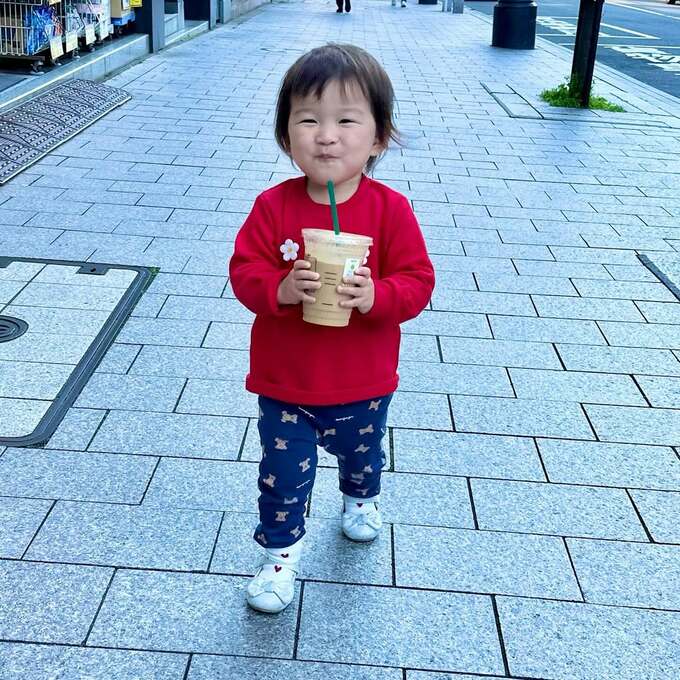 そしてひーちゃんは、大きなテイクアウト用のカップを両手でしっかり抱えて満面のスマイル。アカウントでは「コーヒーを飲みながら、颯爽とオフィス街を歩く2人」と描写しています。