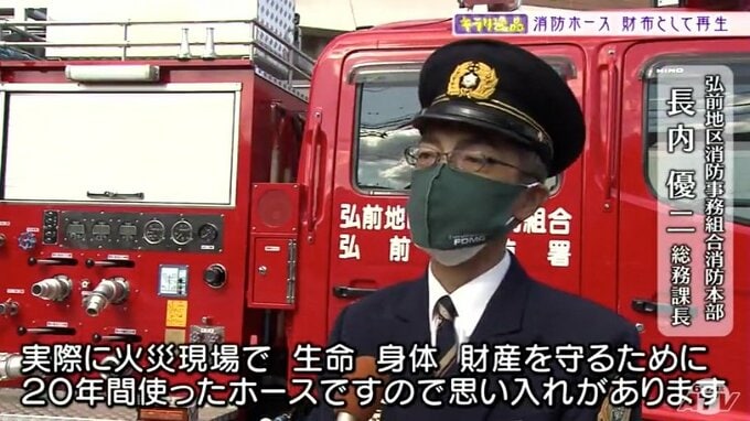 消防ホースの交換時期は10年から20年と言われていて古くなったものは産業廃棄物として捨てられます。弘前地区消防事務組合消防本部ではこれまで愛用してきたホースが新たな商品に生まれ変わることを誇りに感じているといいます。