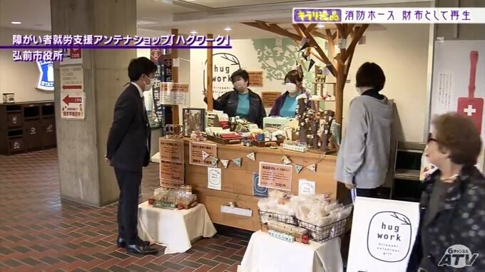 消防ホースで作った財布は、N―STAGEが月に一度、弘前市役所内のブースで販売しているほか、地域のイベントにも積極的に出展してPRしています。
