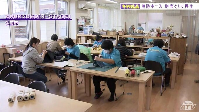 青森県弘前市にある就労継続支援施設NーSTAGE。こちらでは障がいのある人たちが日々作業にあたっています。青森県内の多くの就労支援施設ではパンやクッキーなどといった加工食品を製造していますが、NーSTAGEの特徴は「ものづくり」が中心だということです。その一環で7年ほど前から取り組んでいるのが古くなって使えなくなった消防ホースを再利用した財布の製作です。