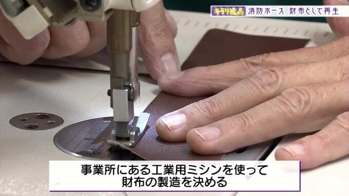 きっかけは珍しい素材を使った製品を作ろうと、インターネットを検索していて見つけた消防ホースの再利用商品との出会いでした。はからずも事業所に工業用ミシンがあるため、高度な財布を作ってみようと決めたと言います。