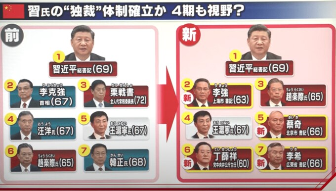 党大会後新しい執行部「中央政治局常務委員」7人が発表された。発表の場では習近平氏に続いて序列順に登場する。7人のトップは李強氏。彼が実質中国のナンバー2となる。李強氏といえば上海のロックダウンで市民ともめた上海市のトップだった。あの混乱によって普通出世コースからは外れたと見られていた。だが彼は、習近平氏が浙江省のトップだった時代の秘書で、習氏の目の動きだけで行動がとれると揶揄されるほどに、従順である点では誰にも負けないという。更に他のメンバー6人もほぼすべて側近、かつての部下で固められた。チャイナ7という人もいるがさながら“イエスマン7”だ。一方で、胡錦濤氏を支えた李克強氏、その後継者といわれ実力のある胡春華副首相は降格し表舞台から完全に姿を消した。