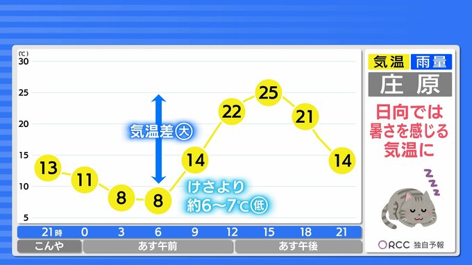 こんやからあす朝にかけて気温が下がり、朝の冷え込みは沿岸部で3℃前後、北部や内陸部では5℃前後強まる見込みです。あす朝は、きょうよりも厚着をしてお出かけください。日中は25℃以上の地点もある予想なので、寒暖差が大きい一日になります。脱ぎ着しやすい服装でお過ごしください。