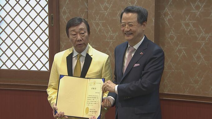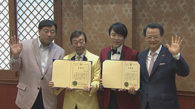歌手の橋幸夫さん、ZEROさんが23日、駐横浜大韓民国総領事館で行われた「韓日友好音楽 “絆” 大使」委嘱状授与式に出席しました。