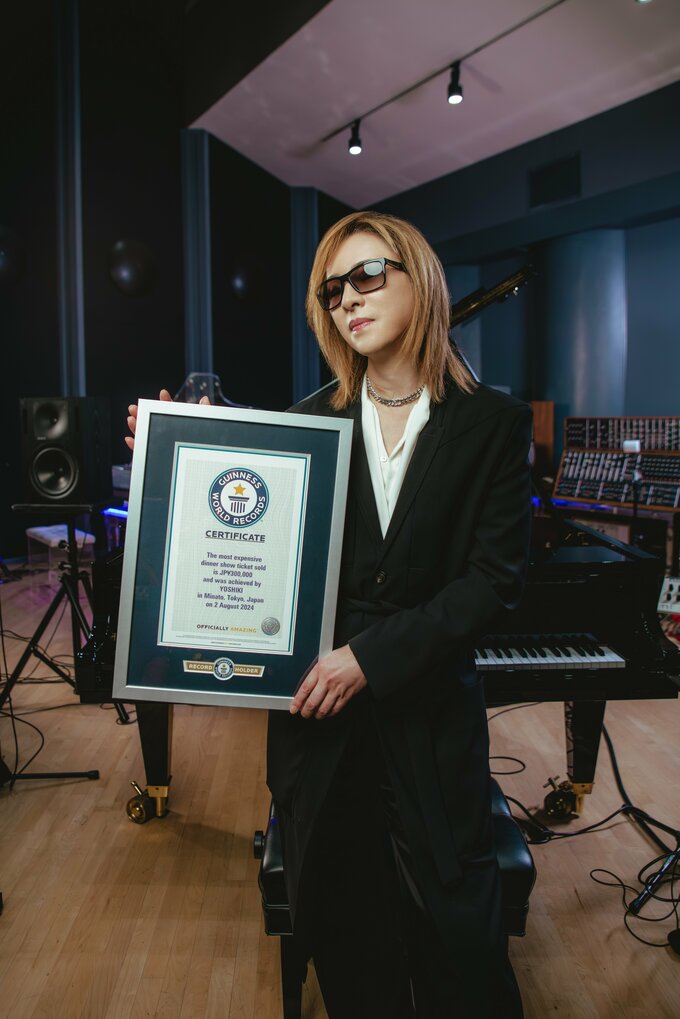 YOSHIKIさんの、2024年8月2日よりグランドハイアット東京で開催された、ディナーショー『EVENING / BREAKFAST with YOSHIKI 2024 in TOKYO JAPAN』にて販売され、即完売となった、1 席30万円のチケット「VIP プレミアムパッケージ」が、「Most expensive dinner show ticket sold(最も高額で完売したディナーショーチケット)」としてギネス世界記録™に認定。