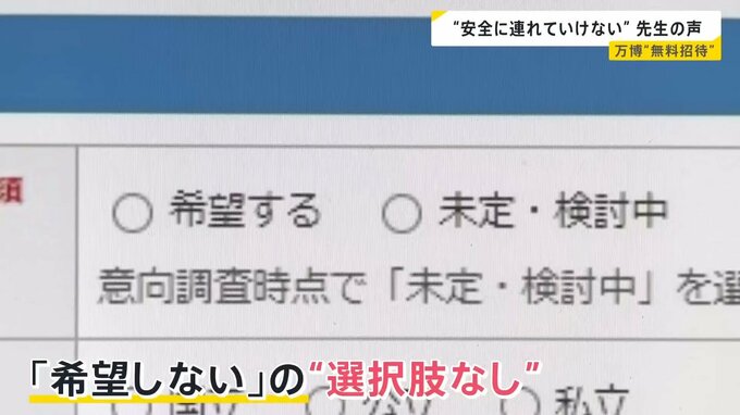 去年、各学校で実施された「万博の無料招待への参加有無を確認するアンケート」では、選択肢は訪問を「希望する」「未定・検討中」のみで、「希望しない」の選択肢はなかったといいます。