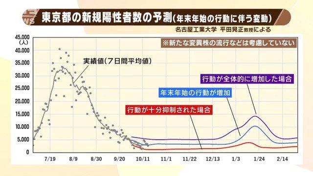 ―――全国の新規感染者数、第8波に向けてどうなっていくのか。名古屋工業大学のデータによりますと、東京都の新規陽性者数の増加予測は、三つの行動パターンに分けて、年明け頃に小さい山になりそうだという予測ですが、行動が全体的に増加した場合でも、第7波の2分の1以下にとどまるのではないかといいます。ただしこれは、新たな変異株の流行などは考慮していないグラフだということです。