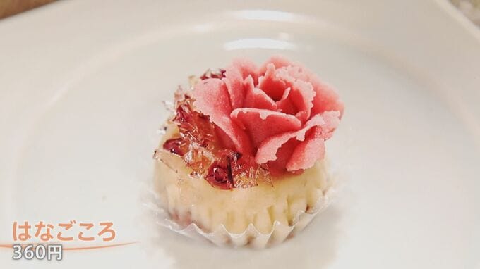 メニューは常時7種類。定番2種類以外の5つは全て日替わりです。旬の食材をふんだんに使い、この店でしか味わうことができないものばかり。この日の一番人気はバラを使った「はなごころ」(360円)。