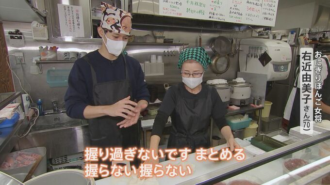 「(おにぎりを)持って、1回2回でもいいんだけど。握り過ぎないです。まとめる。握らない握らない」