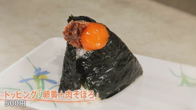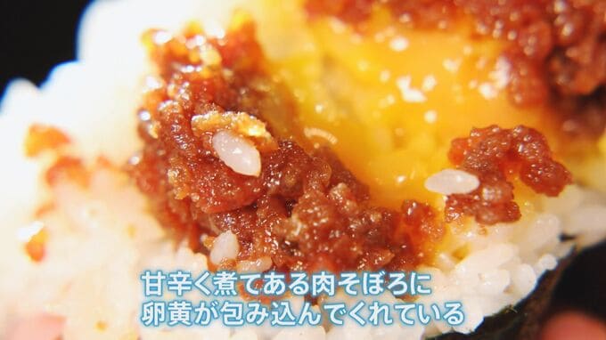 「甘辛く煮た肉そぼろに卵黄が包み込んでくれている。この濃厚な卵黄がおいしいんです。最高のおにぎりですね」