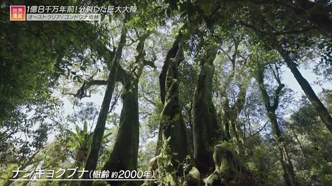 森を探検していた取材スタッフは大きな古木、樹齢2000年のナンキョクブナと出会いました。南極大陸で化石が見つかったことでナンキョクブナと名付けられたのですが実は、ナンキョクブナの仲間は南米大陸にある世界遺産「ロス・アレルス国立公園」でも見つかっています。そして、オーストラリア、南極、南米という3大陸で見つかったという事実が地球のある歴史を裏付けることになったのです。