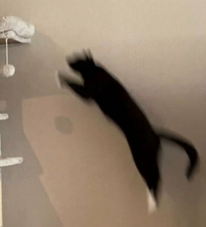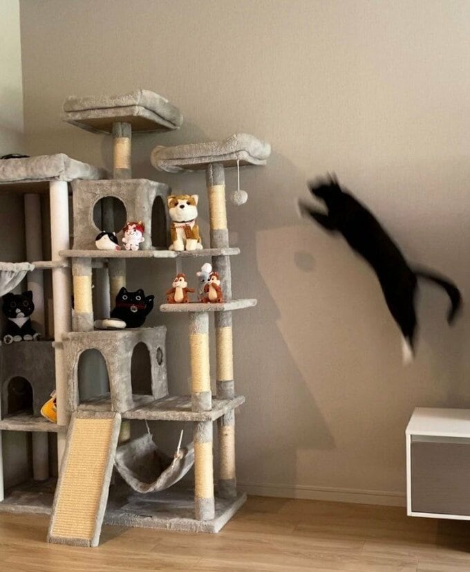 藤さんは、自宅のキャットタワーの写真を投稿。床から150cmはあろうかと思われる高さのタワーが堂々と立っているのですが、その横にはなにやら影のようなものがブレながら写っています。