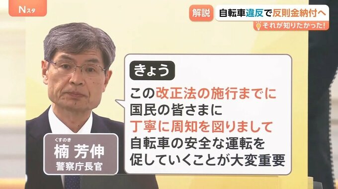 24日の会見で、楠芳伸警察庁長官は「この改正法の施行までに、国民の皆さまに丁寧に周知を図りまして、自転車の安全な運転を促していくことが大変重要」と話しました。
