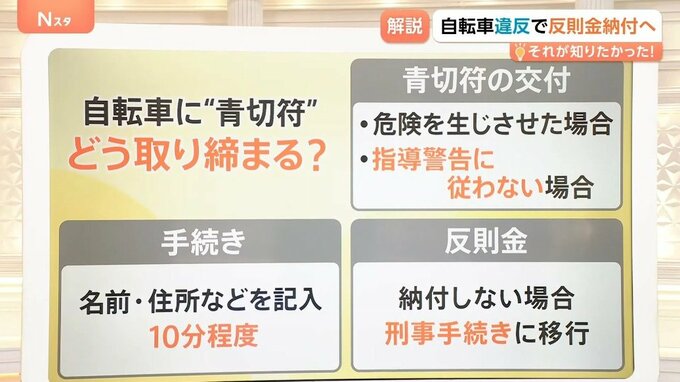 もう一つは▼指導警告に従わない場合で、たとえば「イヤホンを外してください」「傘差しを止めてください」などと言われたのに従わなければ、今後は青切符を交付して違反金を取ることになります。