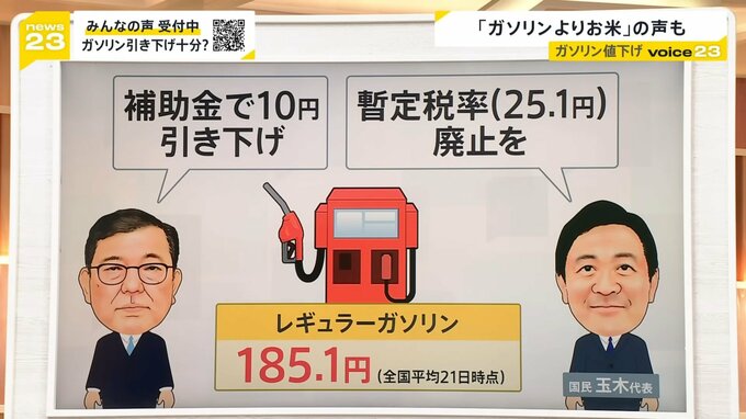 石破総理大臣は5月22日から補助金という形でガソリン価格の10円の引き下げを決めています。一方、野党側からは補助金ではなく減税、25.1円の暫定税率の廃止を求めています。