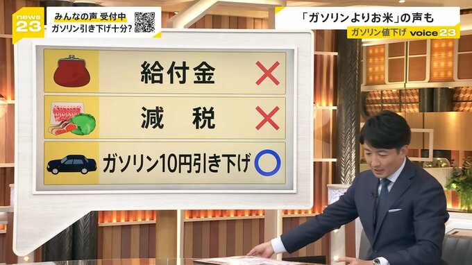 こうしたことを踏まえて街の皆さんに聞いてみると、「ガソリンよりお米の方が助かる」「様々な人が恩恵を受けられる政策がいい」という声が上がっています。この方は、ひょっとしたら車を運転しない方なのかもしれません。