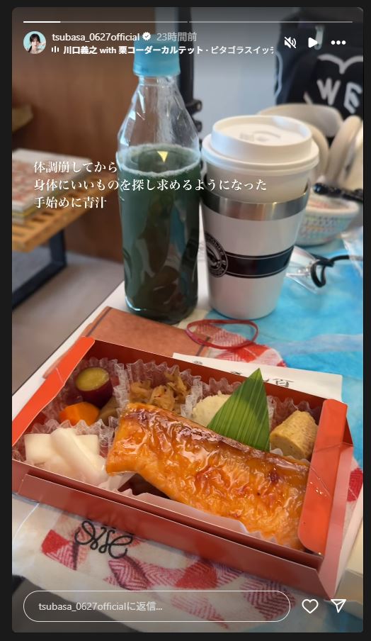 俳優の本田翼さんが、インスタグラムのストーリーズを更新。おいしそうな焼き魚が入ったお弁当とともに、青汁が入っているペットボトルの動画を投稿しました。