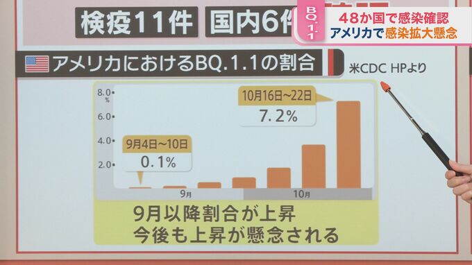 「BQ.1.1」はアメリカなどで拡大しています。2022年9月にナイジェリアで報告され、イギリス・フランス・デンマークなど、これまでに48か国で確認されています。日本でも既に検疫で11件、国内で6件確認されています。