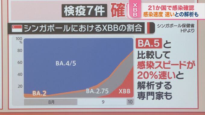 一方のXBBは、シンガポールなどで拡大しています。2022年9月にシンガポールで報告され、インド・バングラデシュなどこれまで21か国で確認。シンガポールでは感染者の約半数がXBBと推定されています。こちらも日本では検疫で7件確認されています。