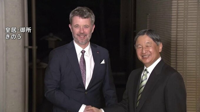 天皇皇后両陛下は25日、来日中のデンマーク国王をお住まいの御所に招き、夕食をともにされました。25日午後7時半ごろ、陛下はデンマークのフレデリック国王を御所の車寄せに出迎え、にこやかに握手を交わされまし…