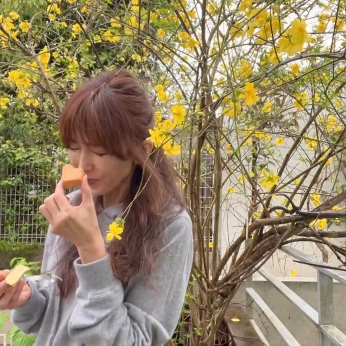 工藤さんは、「パイナップルケーキを食べると、なんだか幸せな気持ちになります」と笑顔の絵文字付きで綴り、動画ではパイナップルケーキをおいしそうにモグモグ。