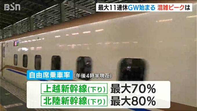JR東日本によりますと、26日午後4時半現在の下り自由席の最大乗車率は上越新幹線が70%、北陸新幹線が80%でした。