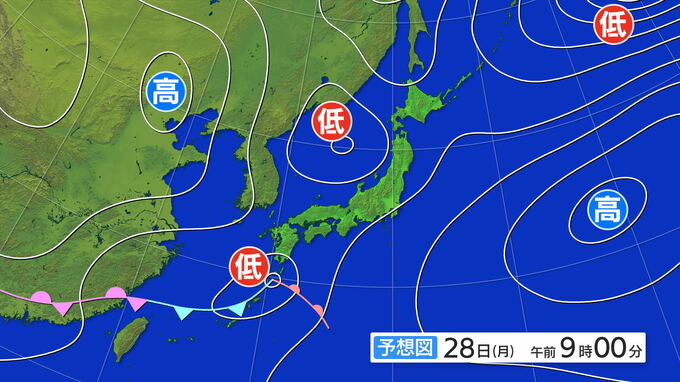 【GWの天気】ゴールデンウィークの前半 28日(月)は九州に加え東日本日本海側や北日本で雨 南西諸島や九州では大雨による土砂災害などに注意を 雨と風シミュレーション 北陸放送 2025年4月26日(土) 18:57 国内 南西諸島付近を進む低気圧の影響で、28日(月)は九州や四国で雨が降る見込みです。九州南部では大雨になるところもありそうです。また、日本海でも低気圧が進み、東日本の日本海側や北日本では急な強い雨のおそれがあります。 28日午前9時の予想天気図です。屋久島付近に中心を持つ低気圧から前線が東西にのびる見込みです。 28日(月)午前9時の予想天気図 日本海にも低気圧があり、東日本の日本海側や北日本では暖かく湿った空気の影響を受け、大気の状態が不安定になるでしょう。