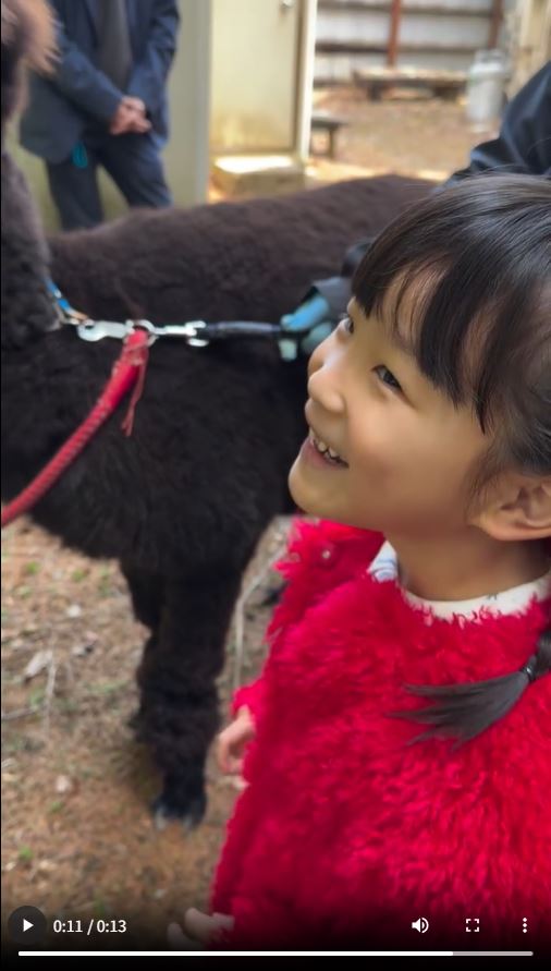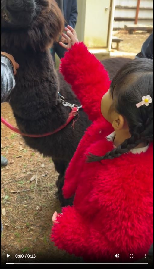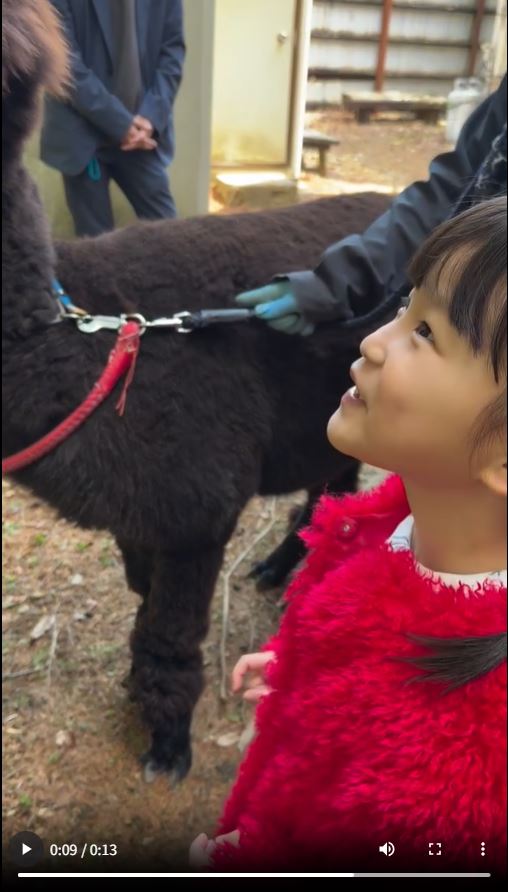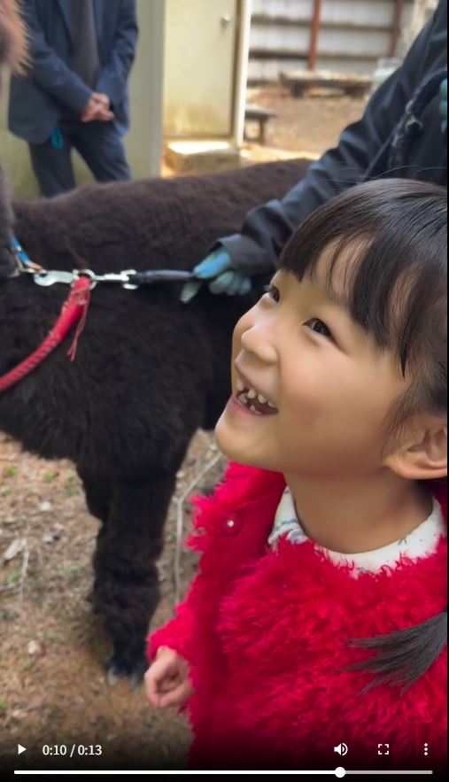 動画では赤い服を着たののちゃんが、茶色のアルパカの耳に触れ、笑顔を見せる様子が写し出されています。