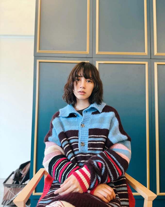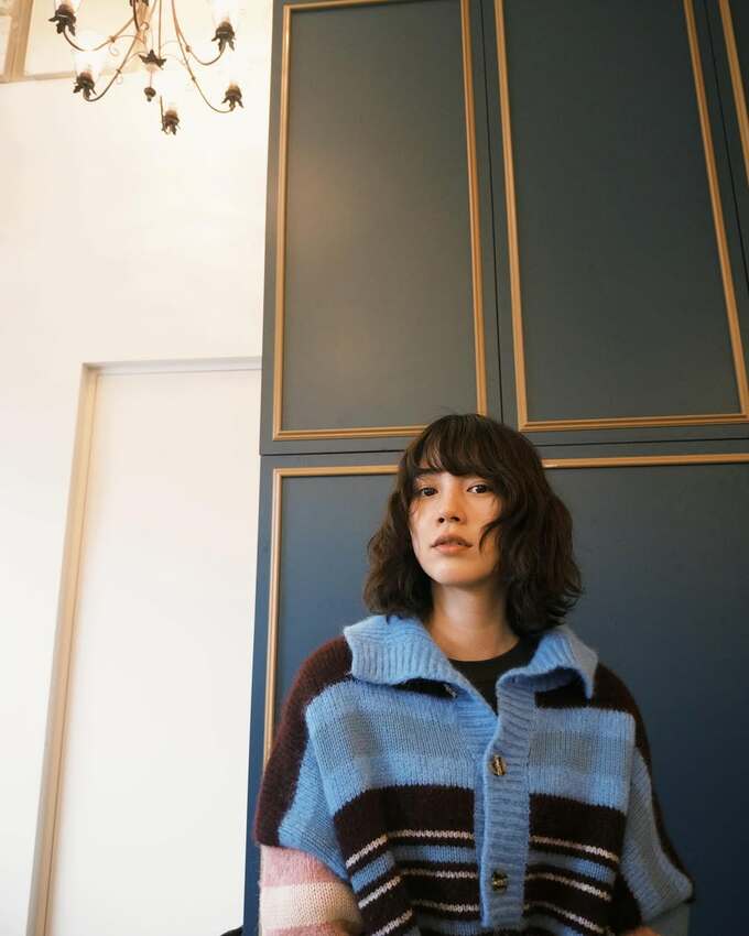 投稿された画像では、のんさんがストライプ柄のセーターを纏い、落ち着いた表情でカメラを見つめています。背景には深い青色と金色の装飾が施されたパネルが配され、シックな雰囲気を醸し出していて、その佇まいからは、大人の女性としての魅力が感じられます。