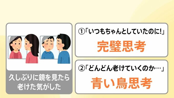問2から、(1)は「完璧思考」、(2)は「青い鳥思考」という考え方の癖がわかります。