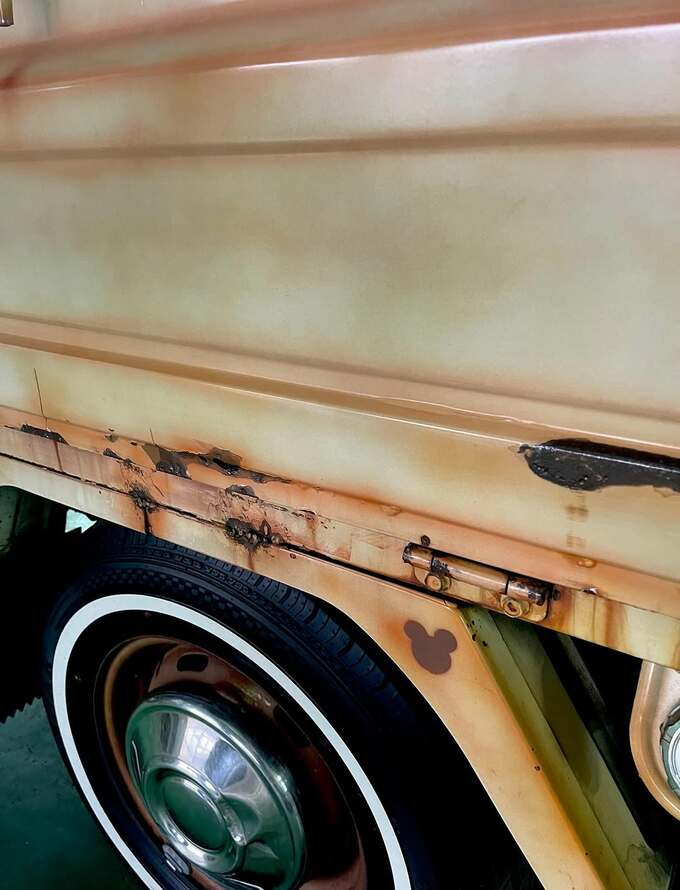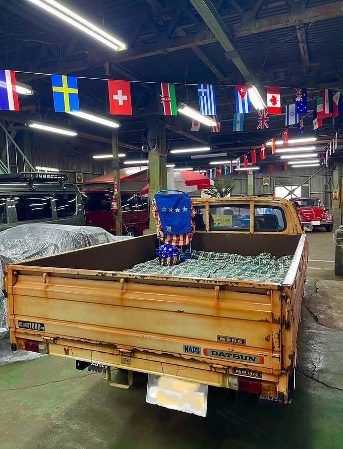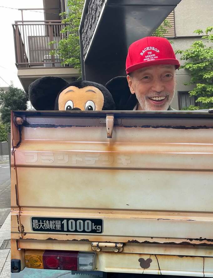 4月21日の投稿で、テリー伊藤さんは「ダットサントラック620 昭和53年式購入」「横須賀バックドロップ秘密基地に到着!」「車体に幾つかのエージング加工の隠れミッキー」「スカジャン着て横須賀を走るぞ〜っ」と、綴っていました。