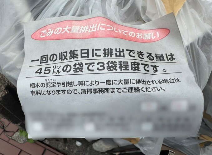 続けて、「ごみを一回に出していい量は、だいたいどこの自治体も3〜4袋なので、お気をつけくださいね!理由は回収するべき所まで清掃車が回収できなくなるからです!」と説明しました。