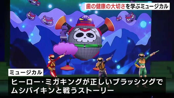 ミュージカルはヒーローのミガキングが、正しいブラッシングで子どもを虫歯にしようとしているムシバイキンと戦うストーリーです。